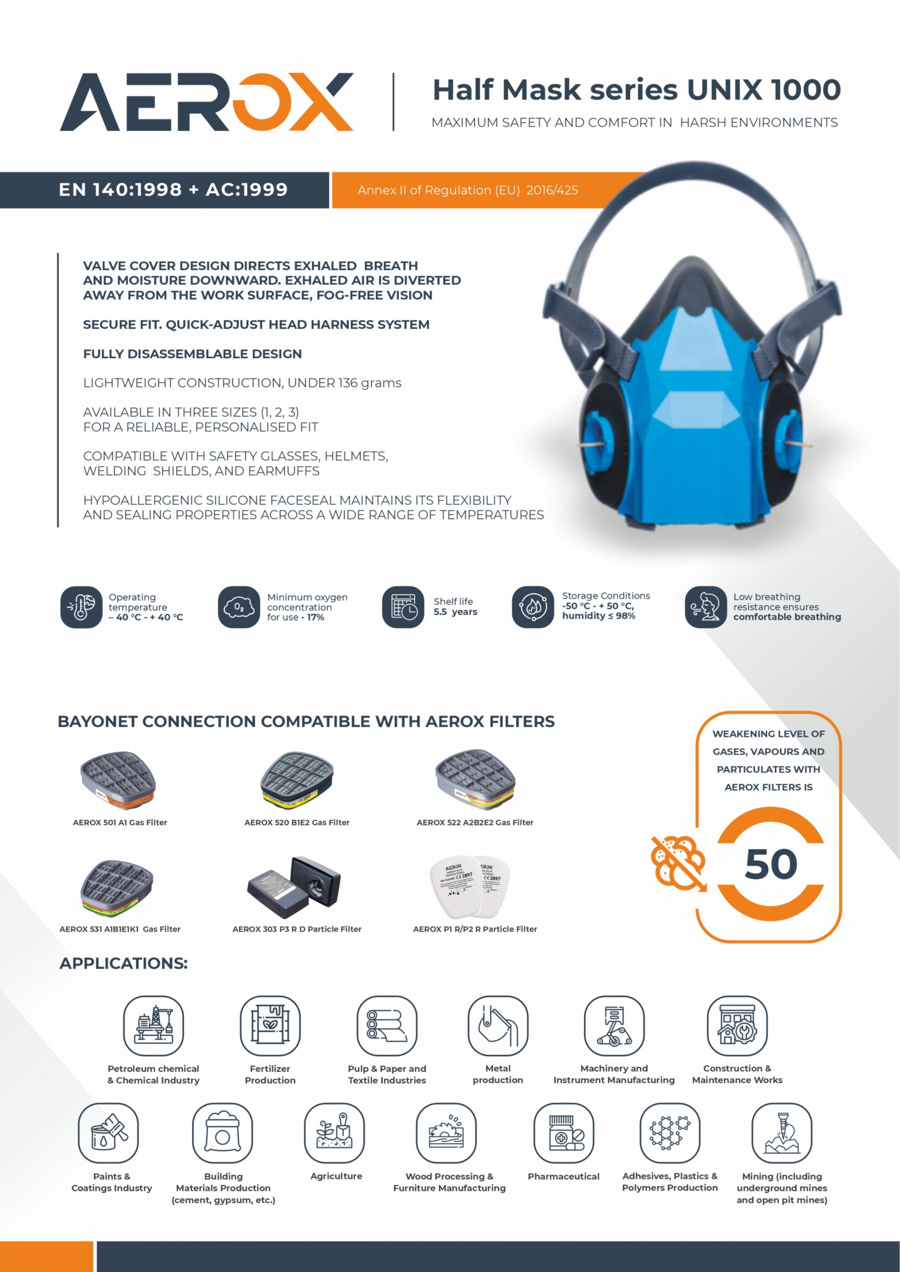 AEROX Half Mask series UNIX 1000, when configured with AEROX gas and particulate filters (filters supplied separately), provides respiratory protection against vapor- and gaseous-phase hazardous substances and particulates (dust, smoke, mist) present in the workplace atmosphere.